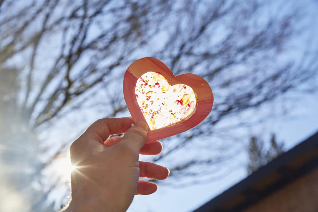 Homemade Valentines Day Cards. Translucent wax paper with melted crayon shavings glued into the negative space of a larger cutout heart made from painted watercolor paper